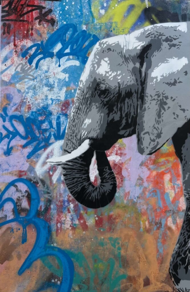 Eléphant, OneAck, acrylique et aérosol sur toile, 100×65 cm, 1500 €