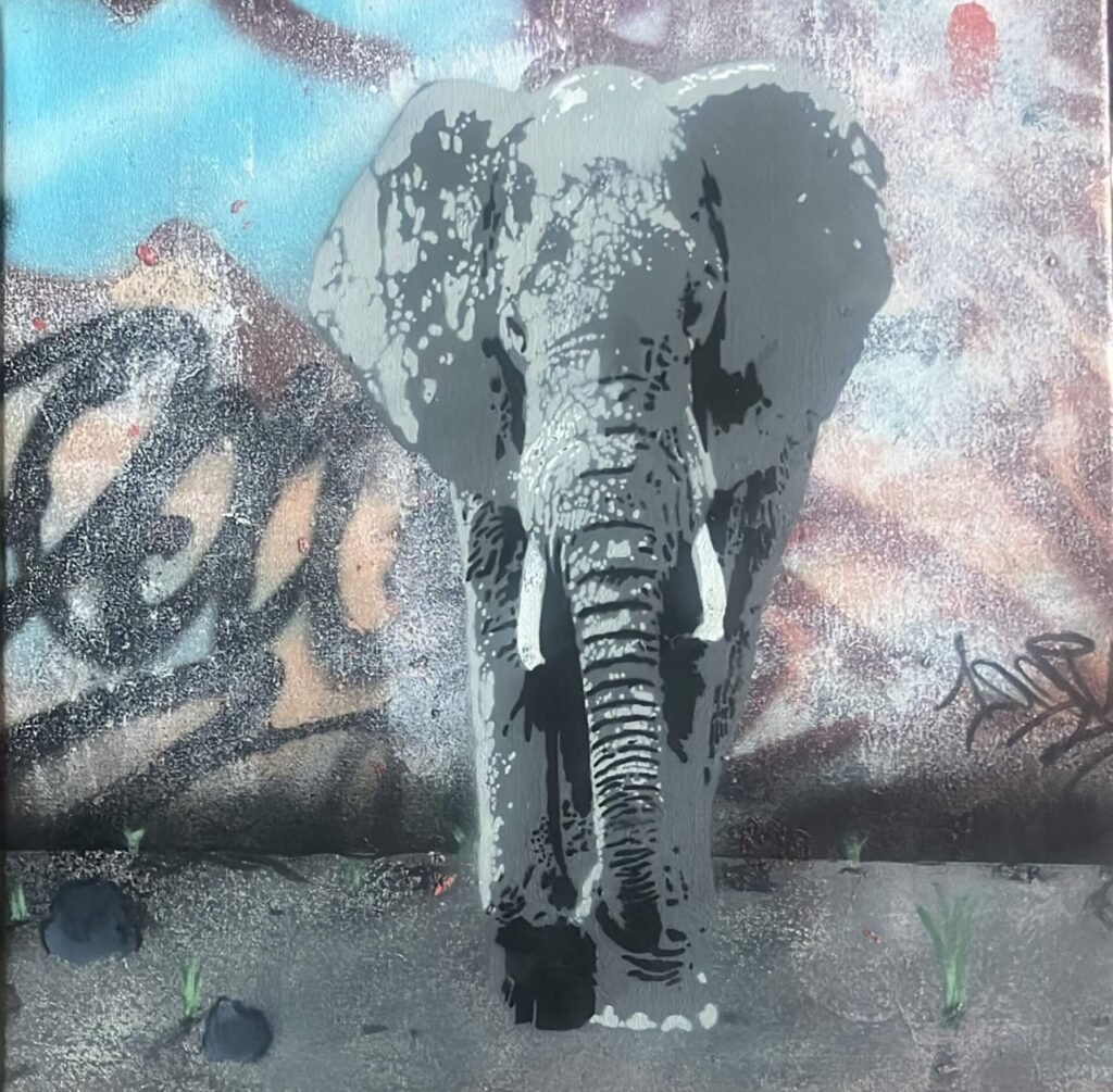 Elephant, OneAck, acrylique et aérosol sur toile, 40×40 cm, 650 €