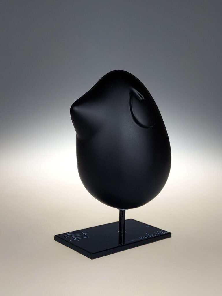 Piaf PopRock, fond crème, noir et fluo rose, dos, modèle 2, pièce unique , Valérie Marty, résine coulée laquée peinte à la main, 16 cm, 560 €