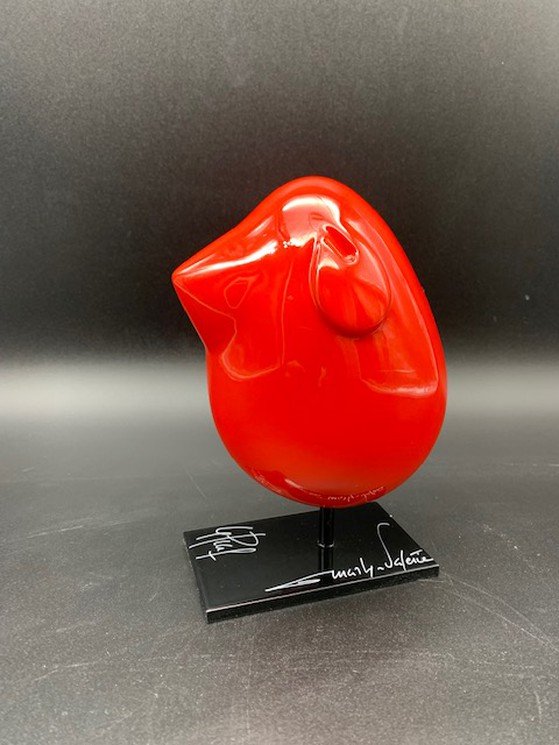Piaf popRock rouge fluo, profil droit, modèle 2, pièce unique, Valérie Marty, résine coulée laquée peinte à la main, 16 cm, 650 €